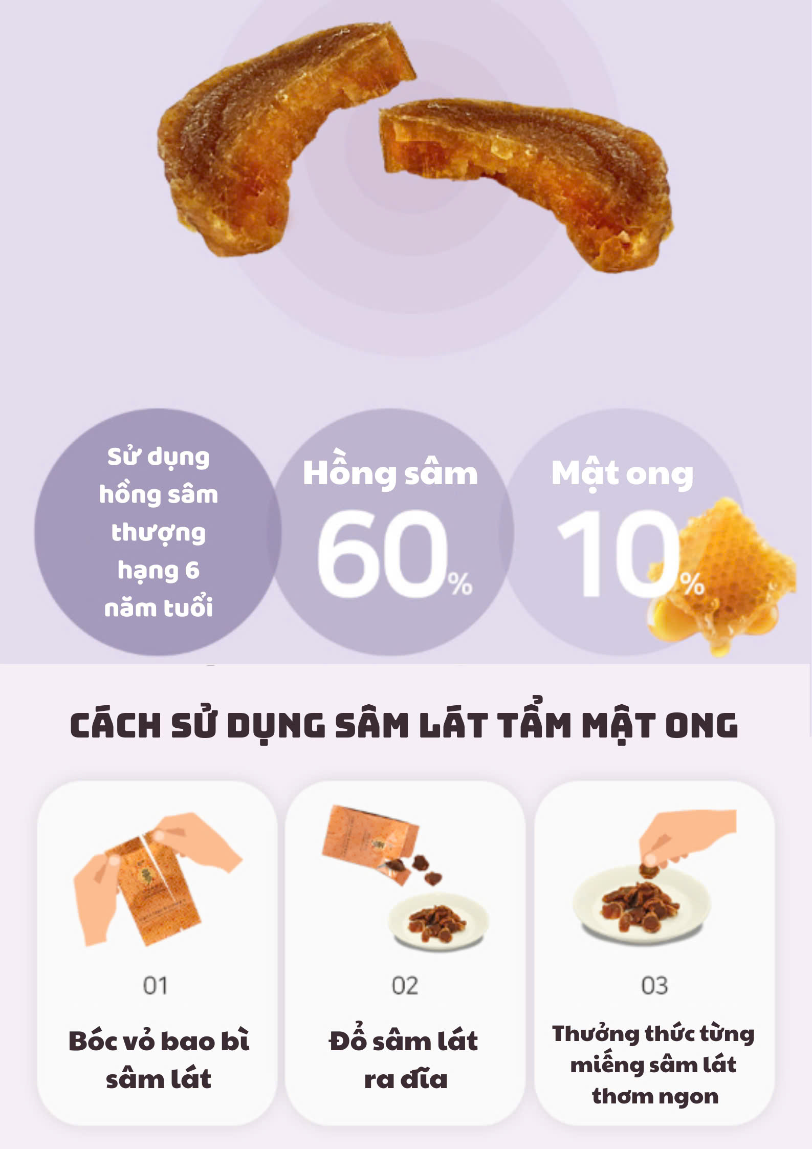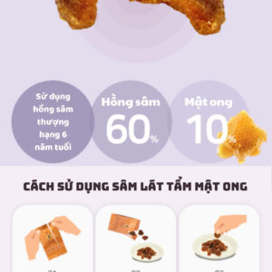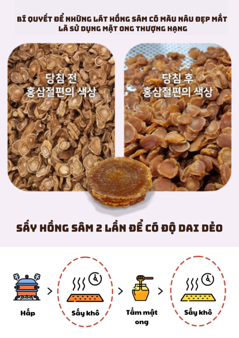 - Lát sâm được cắt tỉ mỉ, bảo quản bằng mật ong nguyên chất
