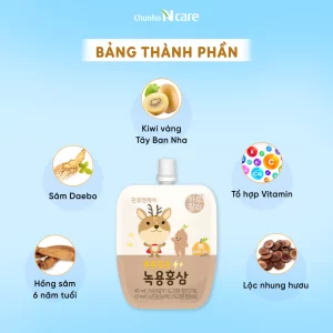 Sản phẩm chứa chiết xuất từ hồng sâm 6 năm tuổi nguyên chất, sâm Daebo, chiết xuất cô đặc từ lộc nhung hươu, cam cô đặc, nước tinh khiết cùng tổ hợp vitamin C, B1, B2, B6, B12 và D3, canxi, axit folic và các lợi khuẩn có lợi cho hệ miễn dịch và tiêu hóa của trẻ.